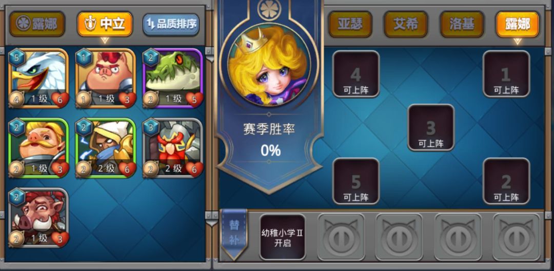 露娜自带的阵容,比较适合敌方整体分布均匀,我方全阵打掩护,伺机突破的局。