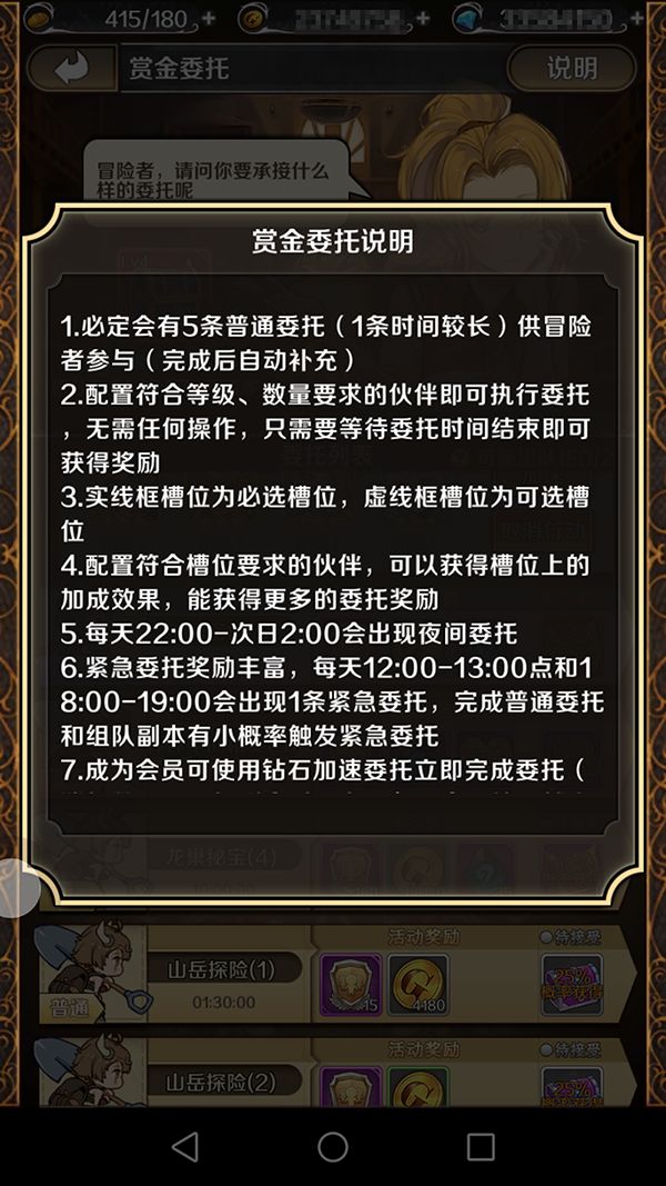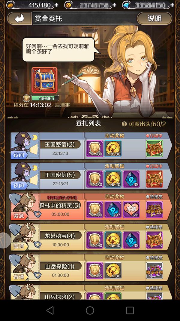 在赏金委托里有很多种任务可供冒险者选择:森林中的精灵、国王的密信、龙巢秘宝等,不同的任务奖励和要求也是不同的,冒险家不妨将手里的空闲英雄派遣给老板娘做任务获取大量道具奖励。