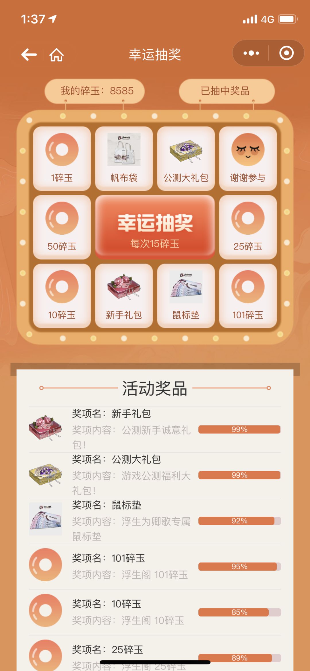 若是刚接触“浮生阁”小程序,暂时没有足够的碎玉兑换“集市”礼包。不妨来“幸运大抽奖”试试嗷!只要15碎玉,就有极大几率获得公测礼包!要是能抽到公测大礼包那是更好啦!