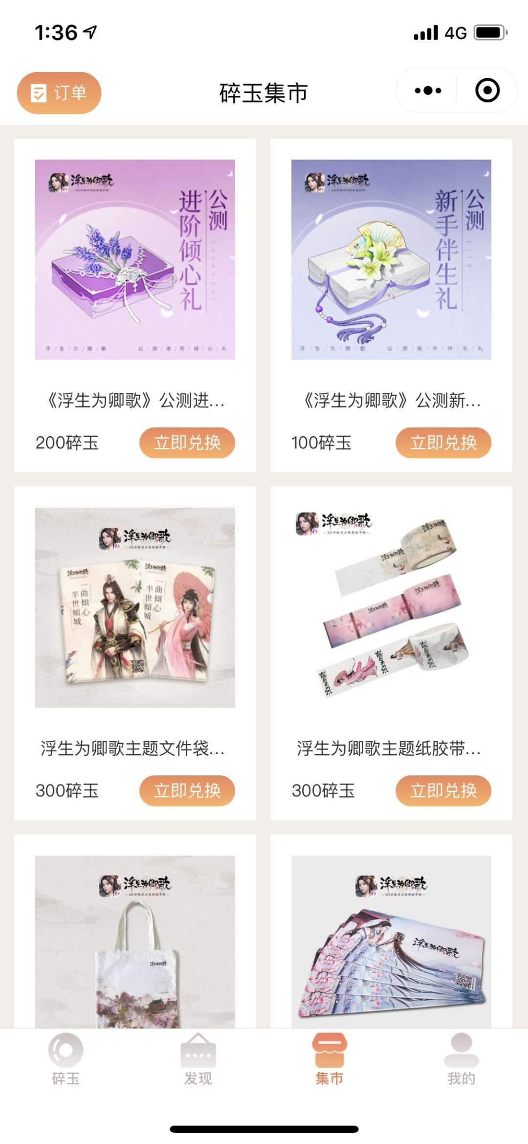 点击 “浮生阁”,跳转小程序,进入页面下方选择“集市”即可进入,“集市”已经包含了“《浮生为卿歌》公测新手伴生礼”(需100碎玉兑换)和“《浮生为卿歌》公测进阶倾心礼”(需200碎玉兑换)。“集市”也还有很多周边可以兑换!