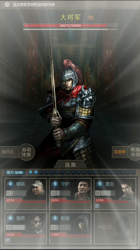 打法嘛,没啥特殊的,一般一直斩指就能过,如果有培养胖子的话,可以在将军半血的时候嘲讽一下,防止我方输出被看脸剑打出爆炸伤害导致扑街(视频里可以看到带有防御buff的胖子被打了2013血,但是带着双重降防debuff的瞎子才掉了1473血),不过重点还是斩指。