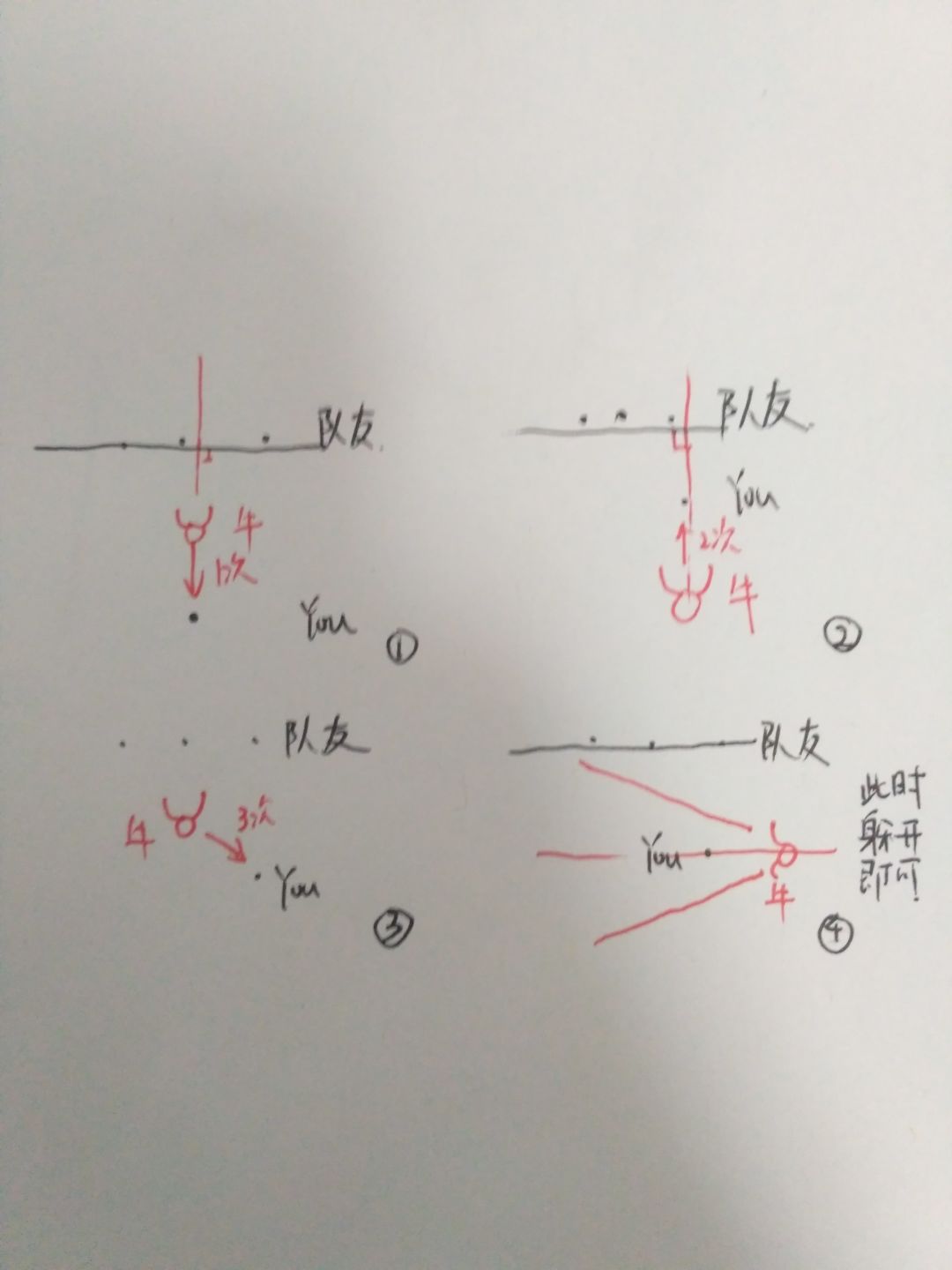 ②如果你的队友背对站(队友在你身后)那么我建议拉怪者以走三角形的方式让牛在第三次撞完后回到原点(附近也可),此时跑到牛身后,即面对队友,成功把扇形波拉到相反方向。