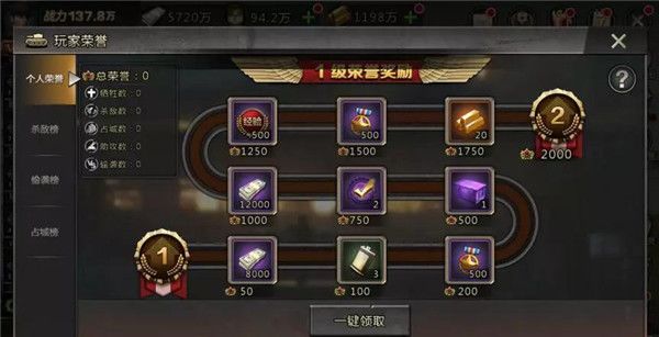 完成全部日常任务及积攒个人荣誉,均可获得一定数量的金砖奖励!