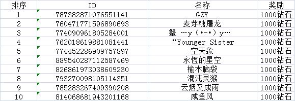 现在让我们恭喜这十位玩家获得游戏1000钻石奖励!!(钻石已发送,请前往游戏内查看~~)