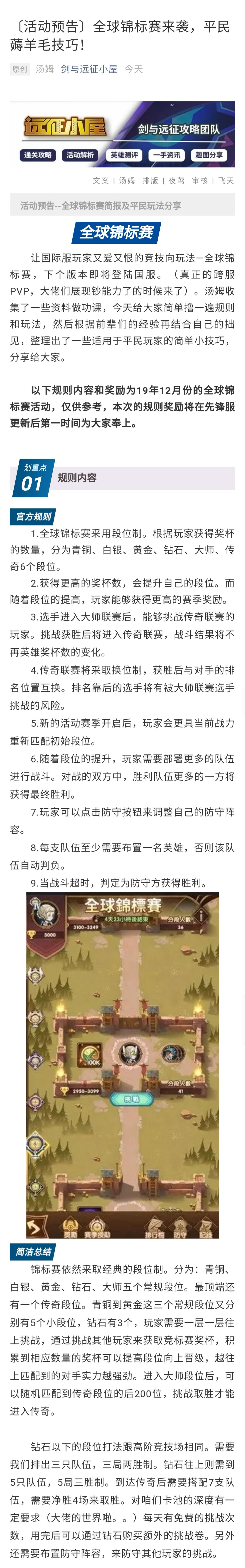 【剑与远征小屋】全球锦标赛玩法以及平民薅羊毛分析