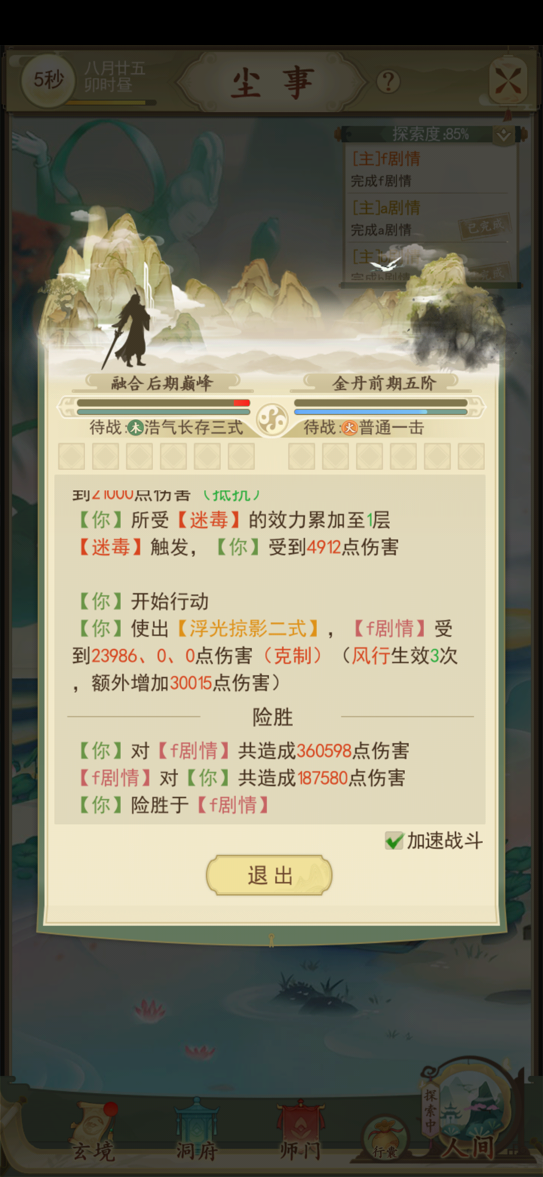 上图是我此时此刻已通的属性,别的修仙不算肝,这个游戏却让我肝了起来,就是那种boss打不过,你就一直研究技能配置和技能套路来打。