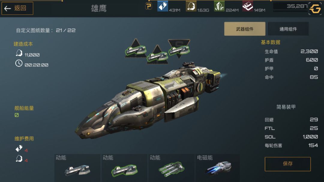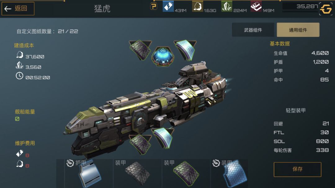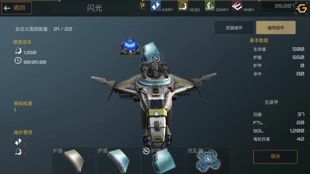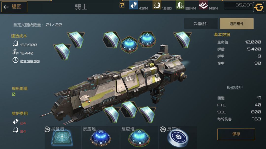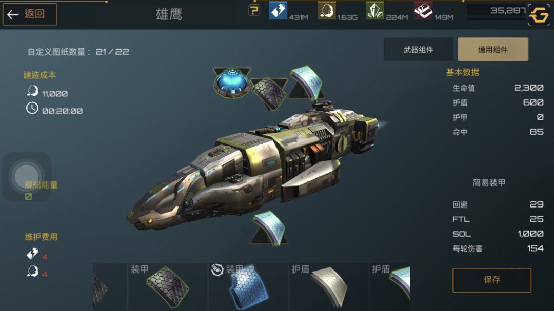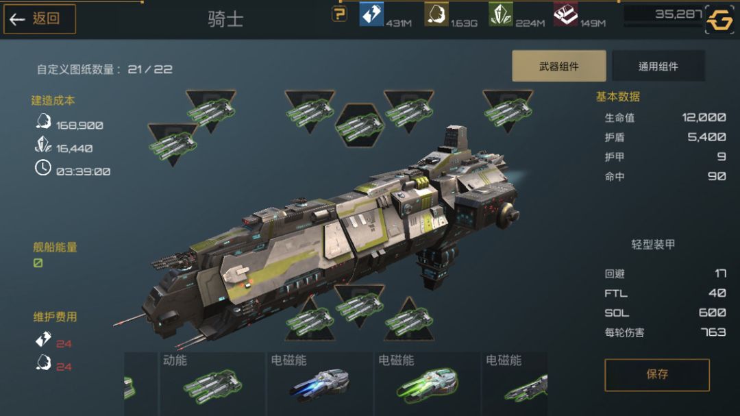 下面是护卫舰,护卫舰是前期非常重要的一个船只,造价便宜,建造时间短,非常适合新手前期暴兵。武器选着全火炮配件选着俩护盾一装甲最大化利用舰船能量。
