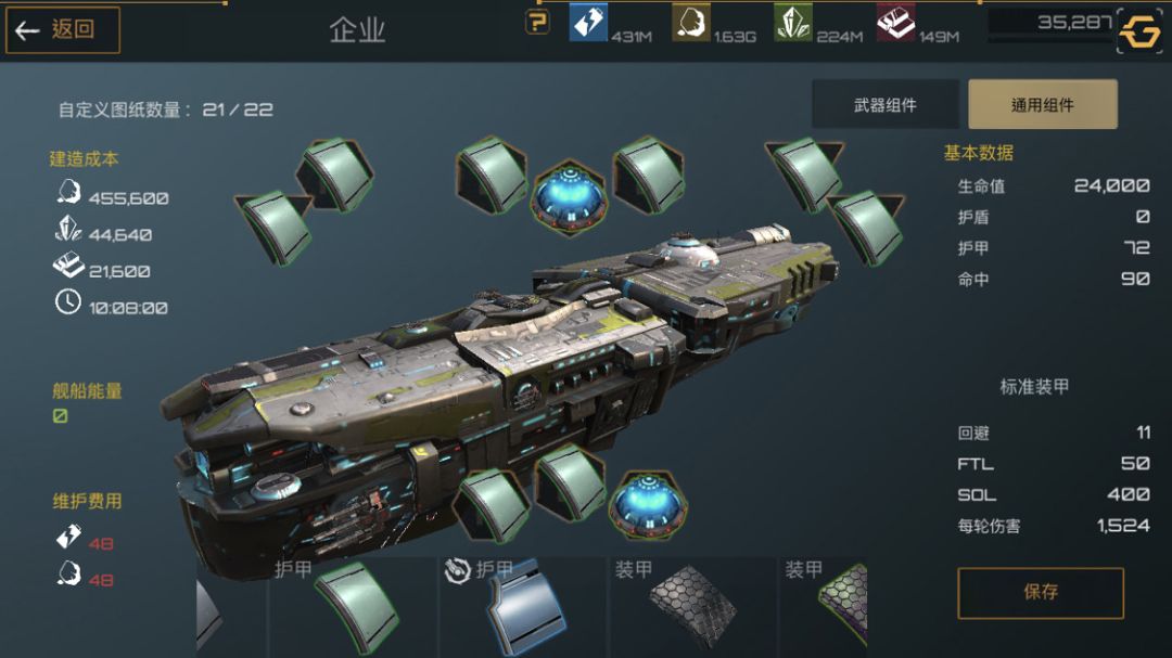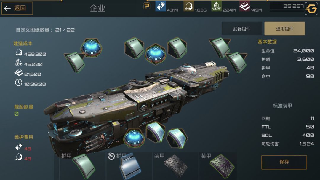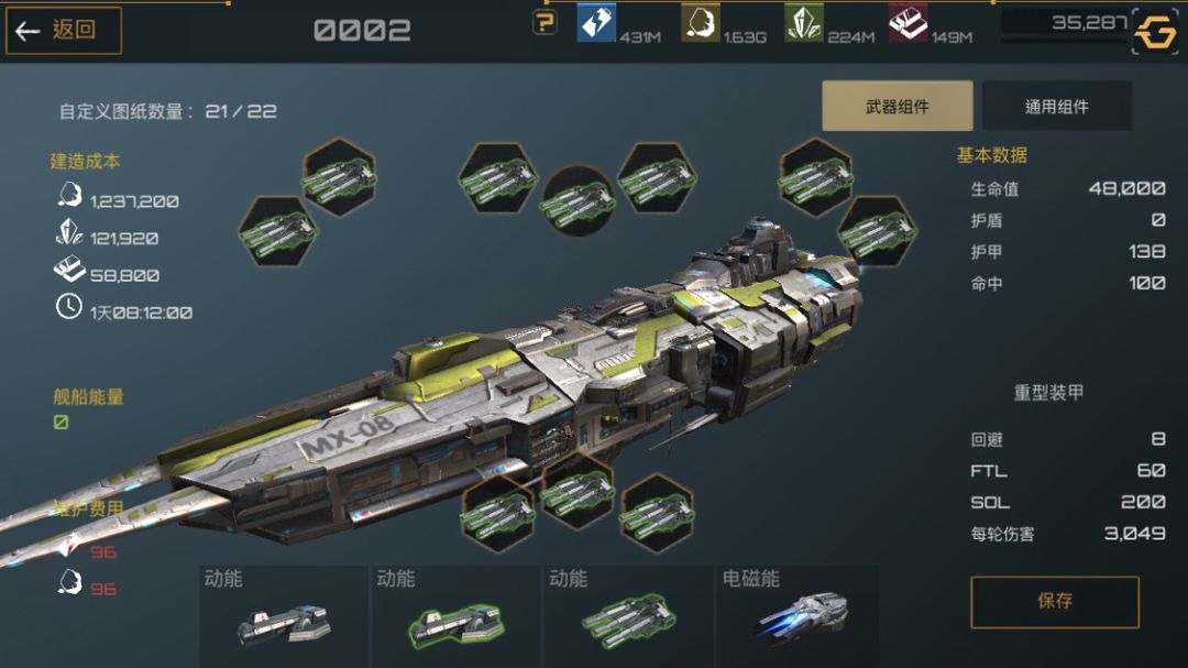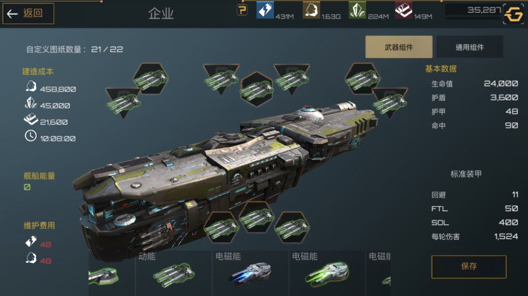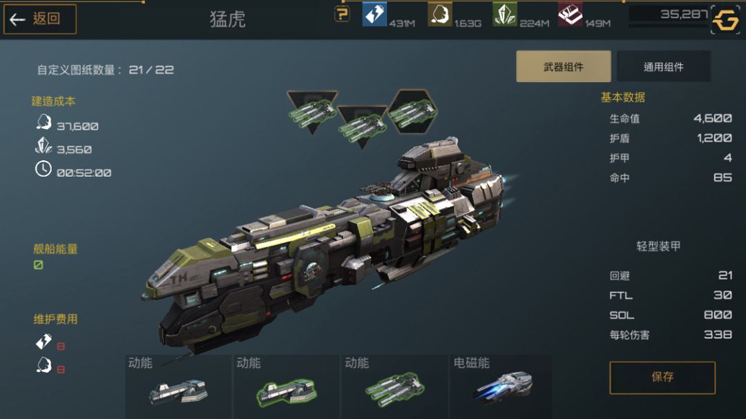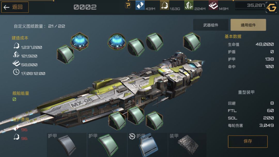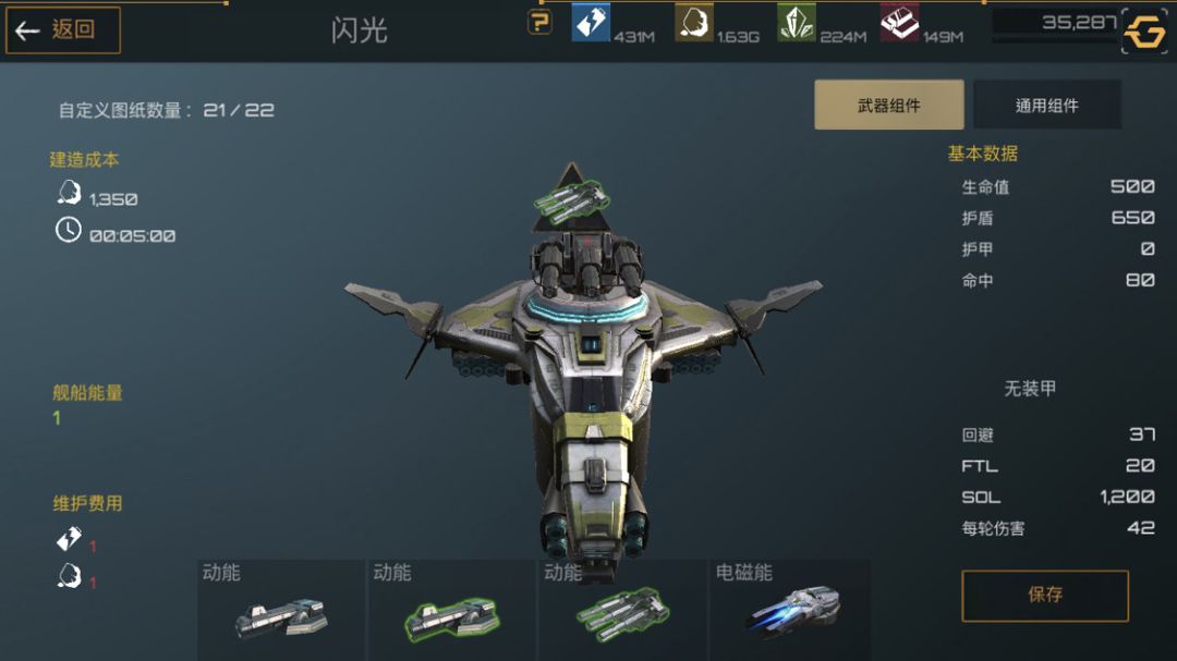 下面是护卫舰,护卫舰是前期非常重要的一个船只,造价便宜,建造时间短,非常适合新手前期暴兵。武器选着全火炮配件选着俩护盾一装甲最大化利用舰船能量。