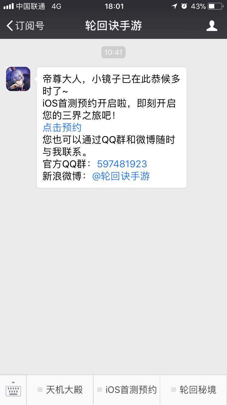 1、 进入轮回诀官方微信号或进入轮回诀官网,点击iOS首测预约;