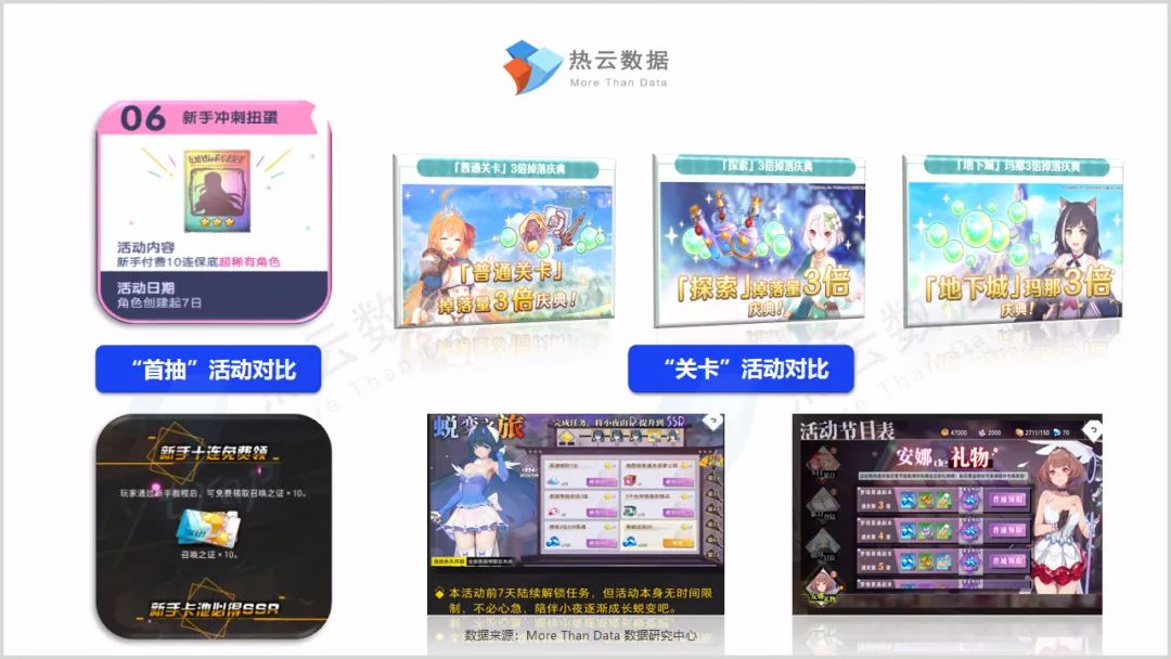 对于游戏内容的“开服活动”上,两款游戏均有“首抽”的标配活动且均保证抽取到SSR。相比之下,《命运神界》更突出“新手免费”;而《公主连结》则为新手付费。此外,《公主连结》同步开启开服“关卡活动”且主要以各种关卡“3倍高爆率”为主;而反观《命运神界》虽有关卡活动,但只被定位为“日常”,并未配合“开服”。