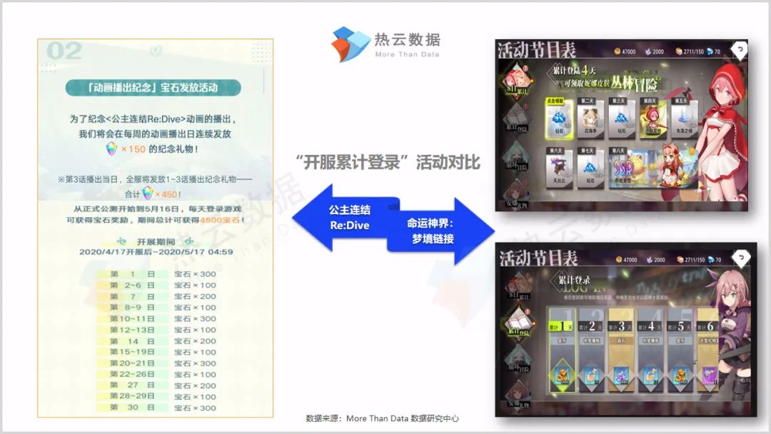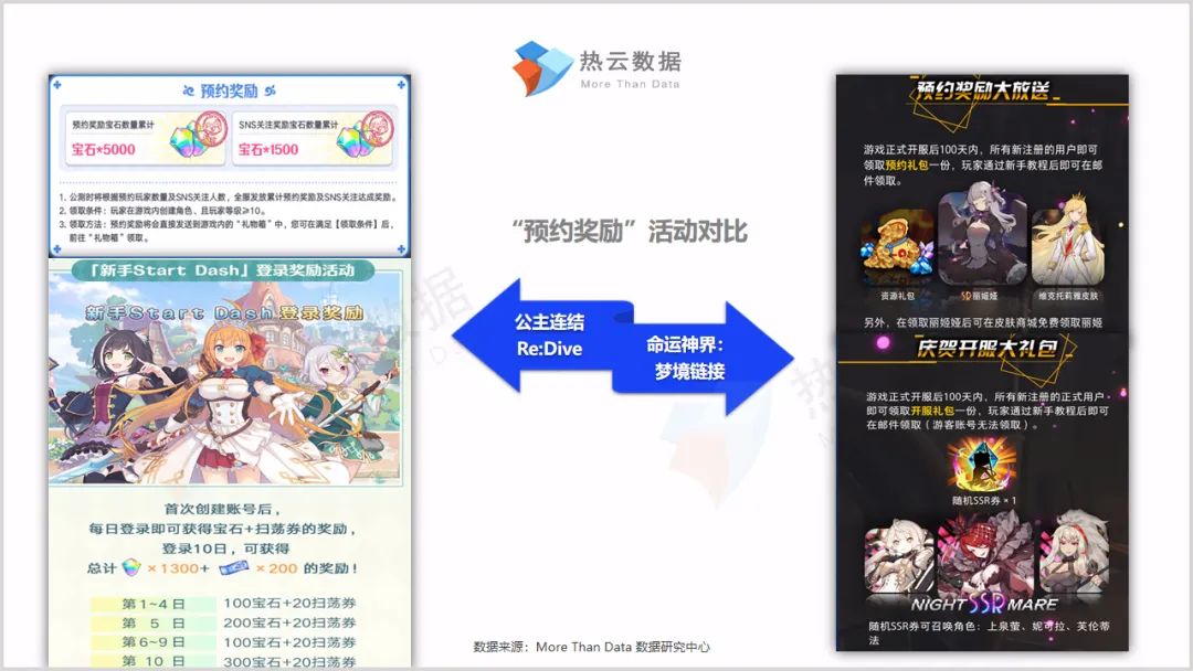 由此可见,两款游戏均为其正式开服公测进行着声势浩大的前期获客宣传。当然,与游戏本身的关联宣传活动同样必不可少。根据两款游戏的官方页面信息,二者均在公测开服之前便开启了游戏“预约/开服奖励”活动宣传。而相比之下,《命运神界》在获客上更下“血本”,其“预约奖励”以及“开服奖励”周期定为100天且从奖励本身主要为解锁更多游戏角色与道具;《公主连结》的周期为30天且奖励主要倾向于游戏内资源。除此之外,《公主连结》与其自身的“番剧IP”产生关联宣传,游戏会随着每周动画的播出而随机发放资源奖励。