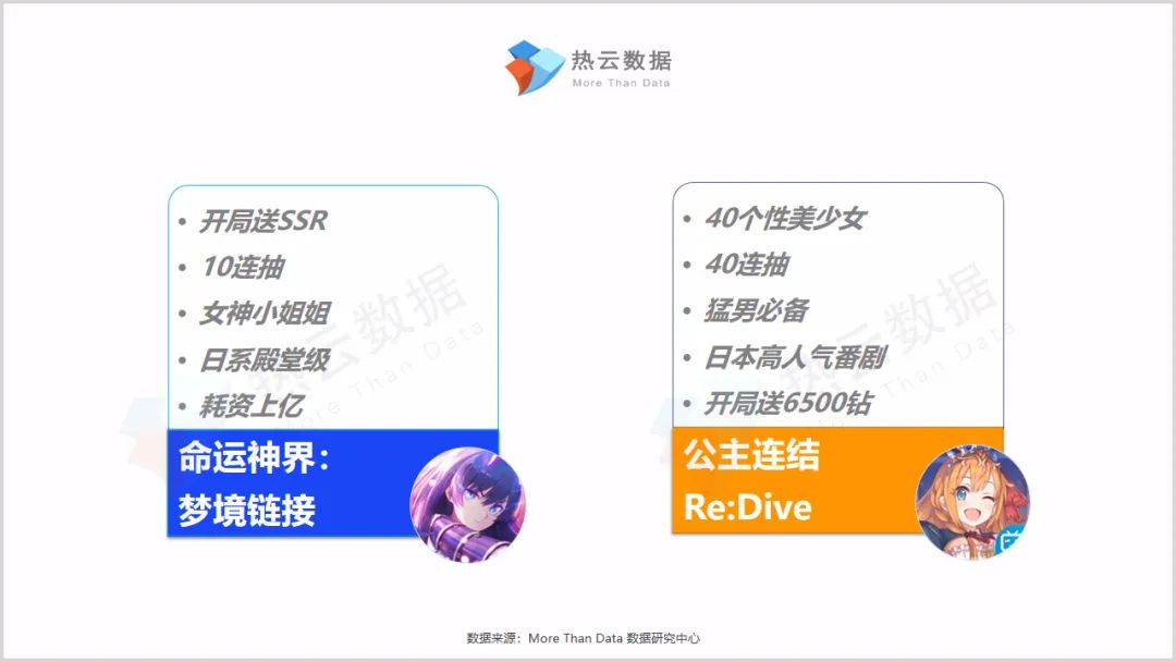 根据热云数据ADI对两款手游的投放文案进行梳理与对比,两款游戏在投放关键词的类型上基本相同,只是相应的词频顺序有些差异。《命运神界》更突出游戏性;而《公主连结》更突出原“番剧”的内容。