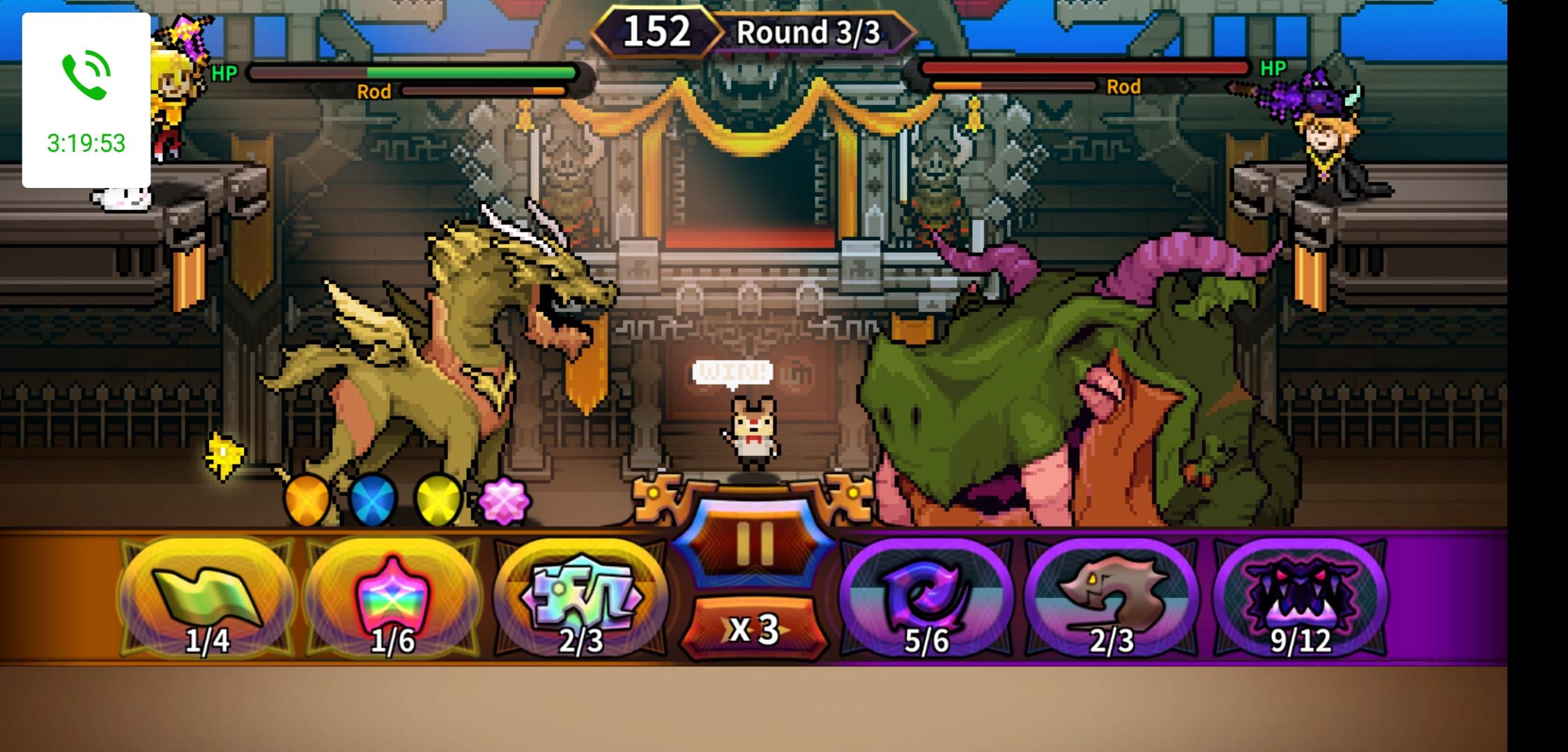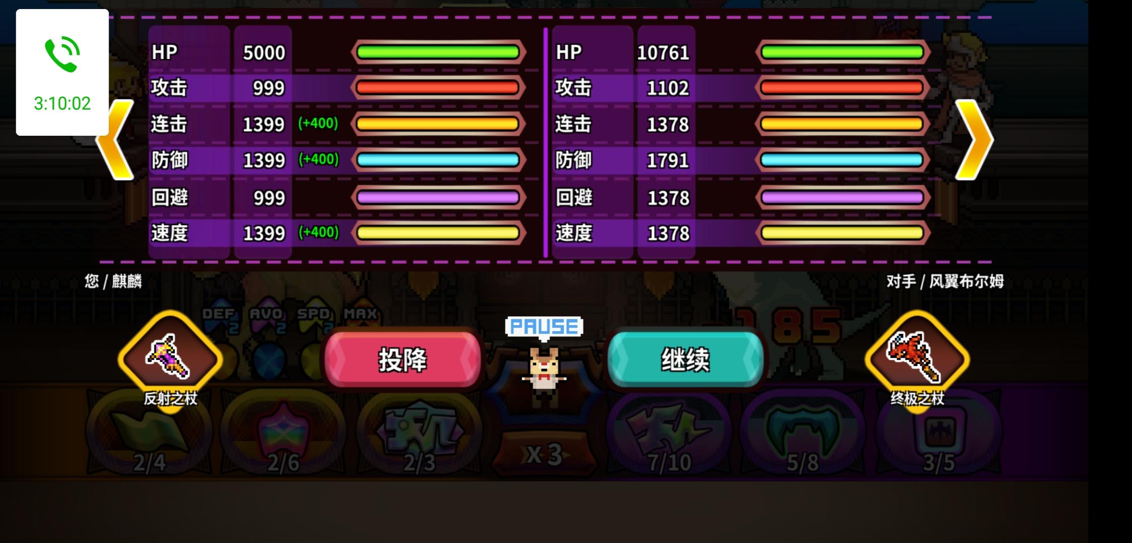 本来用速度最快的电龙玩了一波吸血平a打法,但是伤害和防御都略差一些,所以收集了足够的财宝后试了下帕卡龙(我管它叫麒麟)技能卡对面龙杖使用即可,碰到灭龙用反击,碰到锁定用无敌,剩下保证连击光环能够快速出回避之杖就行了,因为技能针对性很强,而且永动机被动有点看脸,所以不是百分百能打赢(可能会打一半没次数了)但是总归是打的过的,而且要稳定刷技能,实在需要太多钱了……穷打法目前还没研究出来,之后看看能不能找一个不用换技能的打法_(:з」∠)_