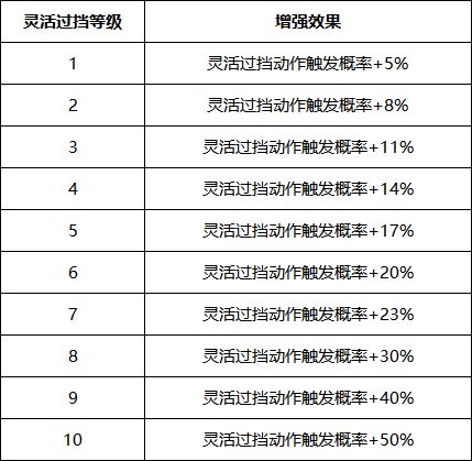 1.2 技能"灵活过挡"可以增加该动作的触发概率,具体增强效果见下表: