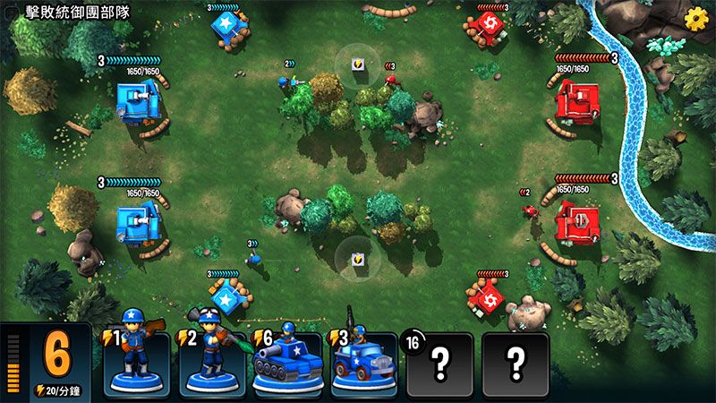 本关统御团会不断的放出战斗机来对我们的地面部队进行干扰,尤其是我们部署的不能移动的单位,两轮战斗机飞过基本没办法在场上站住,所以进入关卡之前注意兵种的升级,一般3-4级就够。对方的主力兵种为坦克、重机枪、火箭筒兵和普通士兵,除了坦克,其余兵种对我们威胁都不大,所以我们带上反坦克卡车。