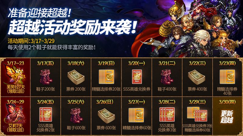 3/29 SSS英雄兑换券3张,精髓选择券60张