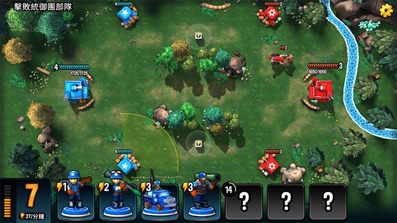 注意榴弹炮架设的位置,我们的卡车可以在中路没有单位时从中路出发偷掉榴弹炮。如果走边路的话会先攻击碉堡,等于送出三点能量。同时,榴弹炮并非只有开局会架设,这一关不宜打空积攒的能量,至少保证随时可以放出卡车应对对方的高杀伤单位。此外,轰炸机会吸引我们火箭筒兵的火力,要看准时机再放出火箭筒。