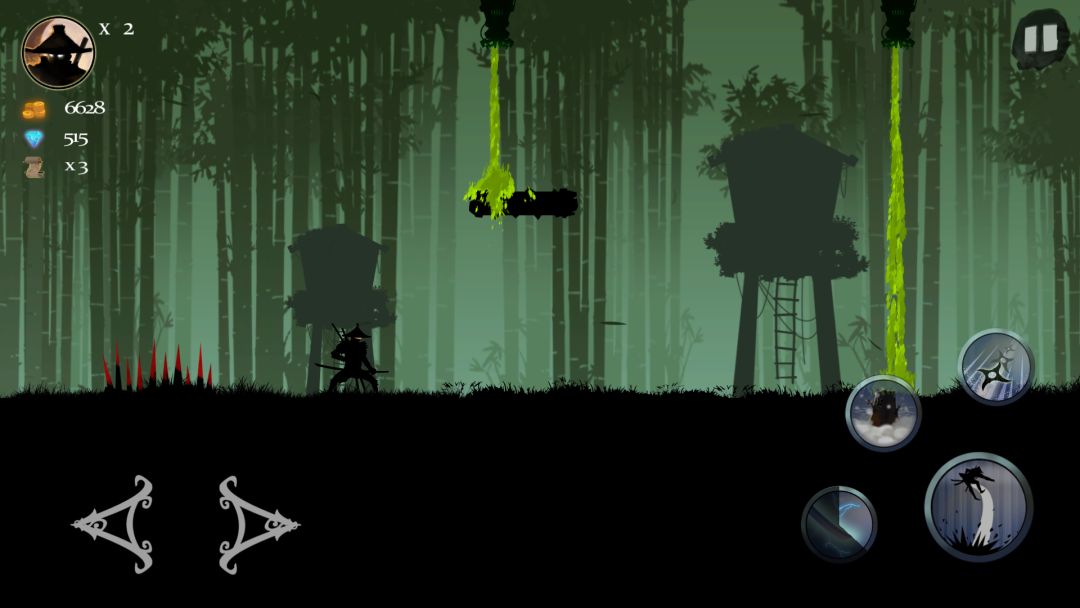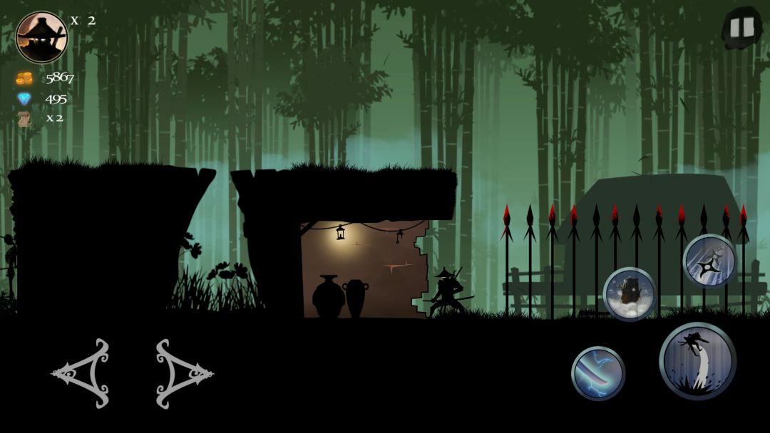 游戏的画面,则使用了剪影风格,相信大家都不会陌生,经典游戏暗影格斗就是这个调调,而相比起来,Ninja Arashi 更加注重背景的细节,很多地方我们还可以看见阳光的变化,简直令人惊叹,路过樱花,也会有种飘动的感觉,不得不感叹开发者的用心。
