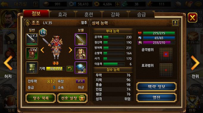 就像游戏名一样曹操是在游戏中S级的英雄。曹操是游戏无数的兵种当中万能型英雄。因为他是个群主系兵种,初始阶段他的攻击范围只能是十字型。但是,到20级的话。攻击范围是8个方面都能攻击。这是战场时非常主要技能。而且,群主系兵种除了攻击以外,有恢复,攻击策略技能,整个方面非常有用。游戏中群主系英雄是必须要有的,玩家玩游戏中不是曹操也可以!建议养成群主系兵种的英雄。