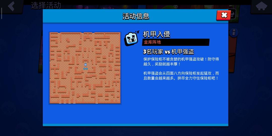 又到了双休日了,又迎来了一周一度的周末限时活动,这周的活动是机甲入侵,需要三名玩家组队协力对抗一波又一波的机甲强盗,守护地图中心的保险柜。