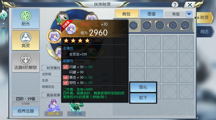 当我们法器达到四阶时会解锁附灵的爽灵阶段,这一阶段推荐玩家镶嵌的灵石是山门经4件套+千里钮两件套,山门经四件套的效果是增加主角5000生命值并且在受到伤害的时候,抵挡自身防御5%的伤害。对于槐院来说,血量的增加就是王道,而四件套的效果可以让槐院在任何战斗中所受伤害永久减少,不论是受到的物理伤害还是法术伤害。而千里钮两件套物理防御+200的属性加成也使得槐院对物理输出型职业如离山剑宗和天机阁的抵抗能力更强。