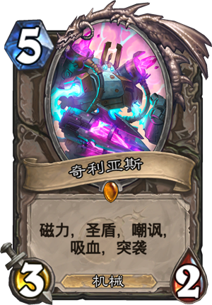 作为一张五费牌奇利亚斯裸下真的很亏,并且作为buff抢血能力也实在一般,随从交换时表现也只能说可观。笔者开始时也是不带的,然而为什么会加进去呢?当然是觉得霸气好看上档次高逼格打不死人吓死人了。