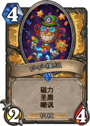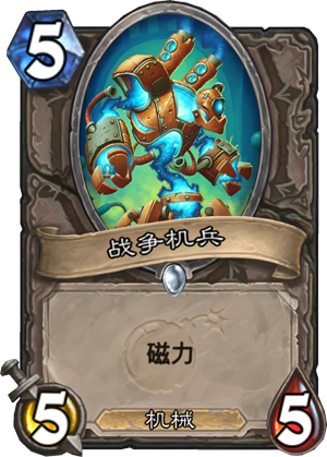 在这套卡组里,这张卡作用很大,核心卡之一,裸下小亏,磁力贴上就是一张高配随从版王者祝福。关键是,这张卡的磁力效果可以当做冲锋,+5/+5意味着能白吃四七七(一般对阵偶数萨一定会用到,机兵buff配合223跃迁者或者222圣盾机器人很容易白换对面一个四七七。)