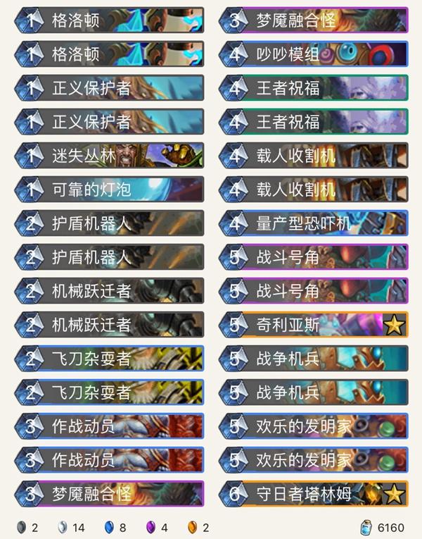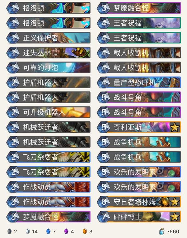 骑士超高质量单卡,对阵奥秘法破法反效果一流,笔者只带一张是因为卡位太紧,不然一定满编。可随意替换任意除格洛顿以外的低费卡。