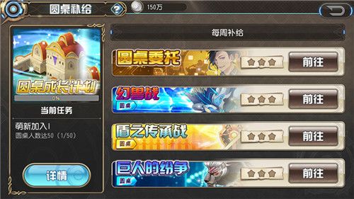 围绕圆桌,现已有许多活动展开。圆桌委托、幻兽战、盾之传承战、巨人的纷争……多样的圆桌活动在给成员们提供成长的试炼场之外,还给予丰厚的奖励作为支援。而成员们通过完成一定数量的圆桌委托、或在圆桌之间的对抗战中集结了一定数量的战力等,还会额外获得圆桌的星级奖励。前置任务完成后,便会有奖赏更加丰厚的后续任务刷新。丰富的圆桌协作活动不但能给亚瑟们提供赫赫勋章、妖精时装券、体力药剂等必要的补给,更能给圆桌带来声望的累积,让圆桌组织在成员的共同努力下逐步成长。