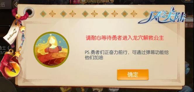左边的任务栏内会同步显示“齐心协力”与“勇者通道”的进度,进度100%后即可深入龙穴见到被捆绑的的公主了。