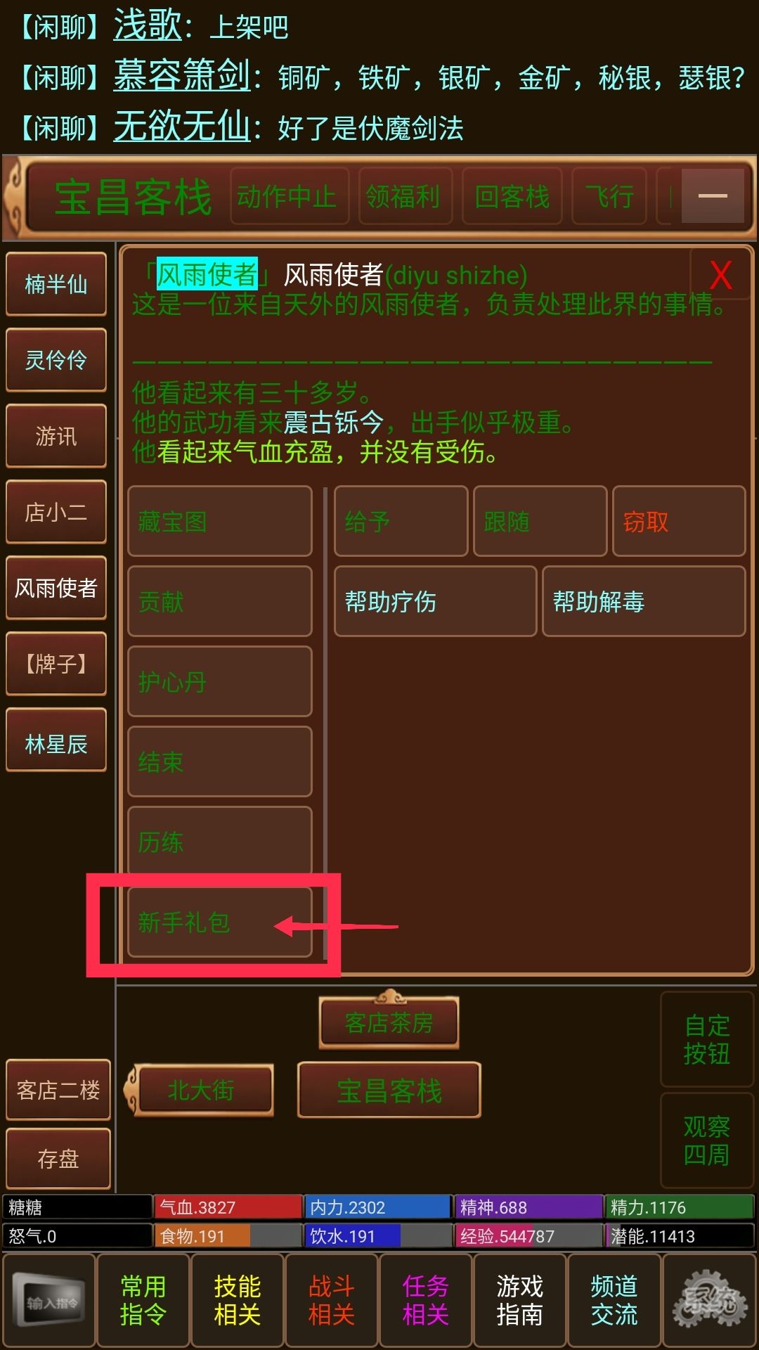 建号完毕后,在扬州客店风雨使者处领取新手礼包