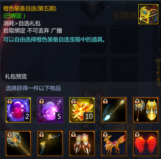 橙色装备自选(第五期)与之前并无不同,还是可获得董军*戮神笔、董军*万向双煞、董军*乌磐斧、董军*紫金弓以及董军*紫狼牙、三尾乘黄、凤舞九天等道具~
