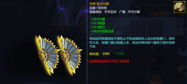 梦梦现在就可以拍着胸脯跟你们说,在第五期金色装备自选中,淬神系列武器回归了!其中包括淬神*金光麟、淬神*金光杖、淬神*金光石、淬神*金光闪和淬神*金光对扇,四圣兽五行翼则依旧存在于本期金色宝箱中。