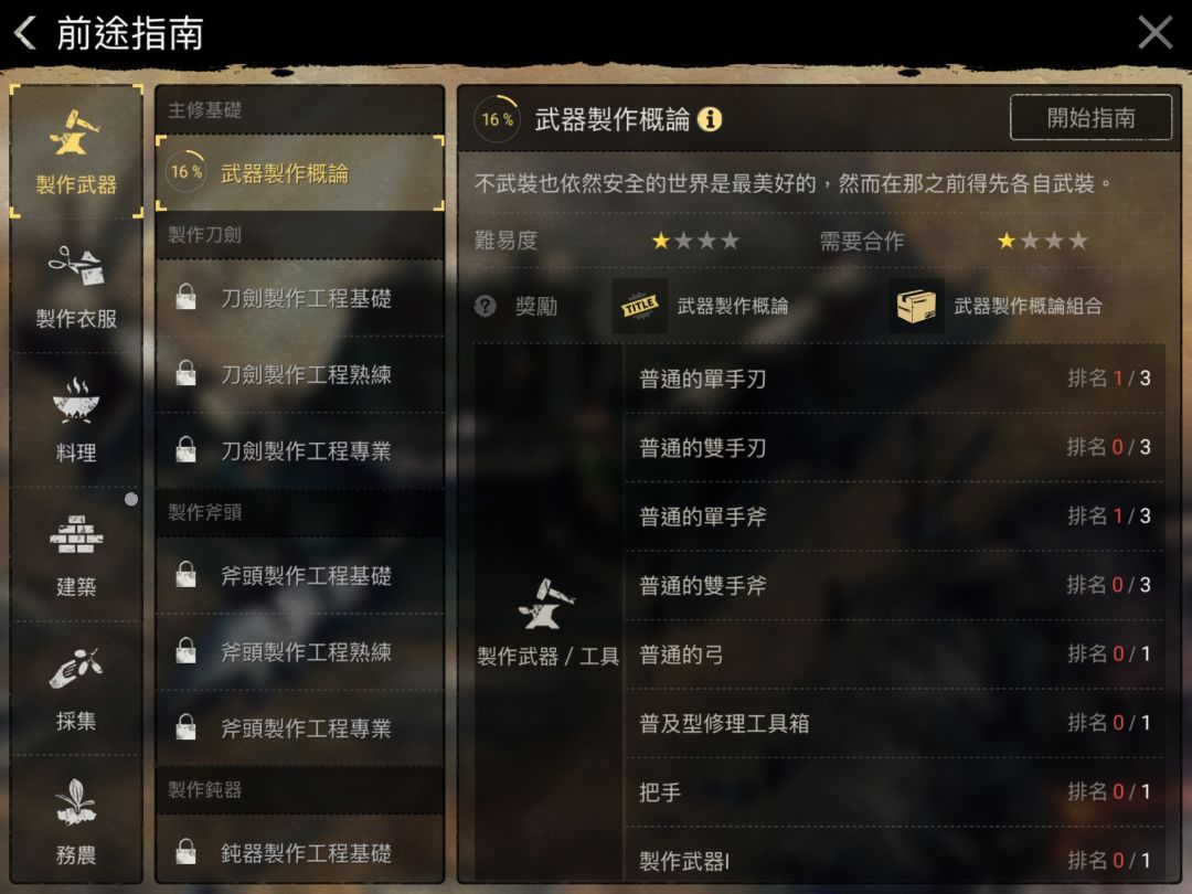 这开始指南有什么用?是不是所有的建筑武器采集等几大类所有都能学满?