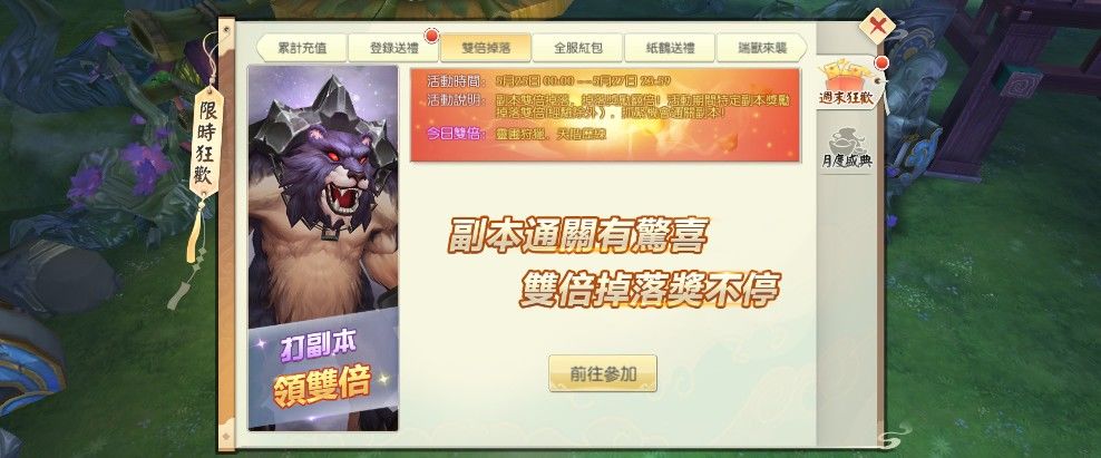 活动内容:副本双倍掉落,掉落奖励双倍!活动期间特定副本奖励掉落双倍,经验除外。抓紧机会通关副本吧!