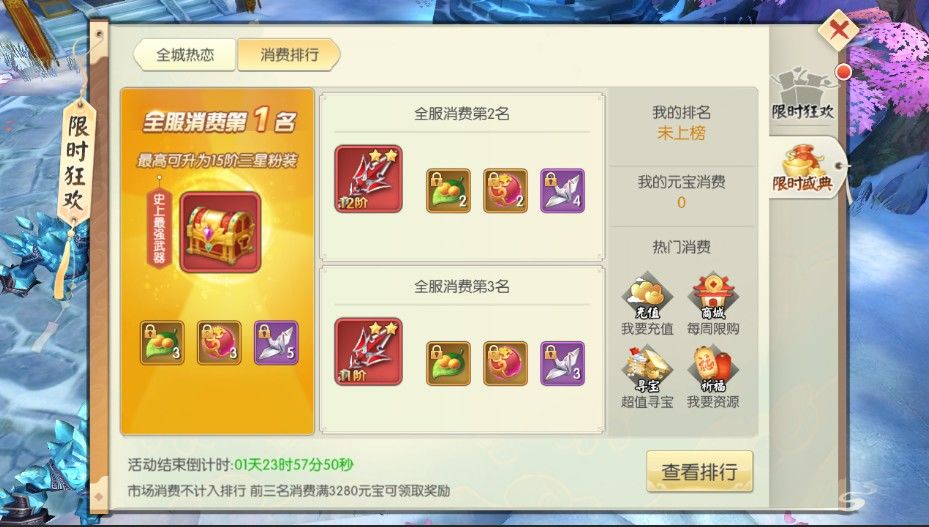 活动内容:活动期间全服消费元宝排名,排名第一可获得灭世武器宝箱(最高可升为15阶三星粉装)