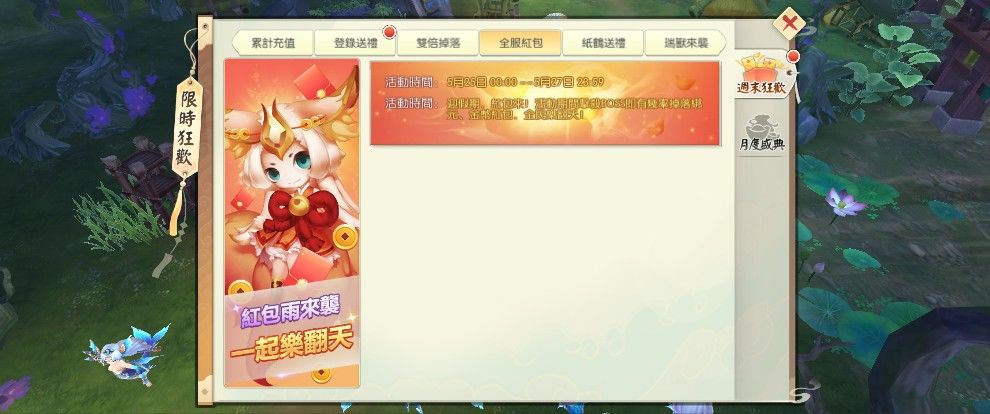 活动内容:活动期间,玩家击杀BOSS有几率掉落绑定元宝、金币红包,全民乐翻天!