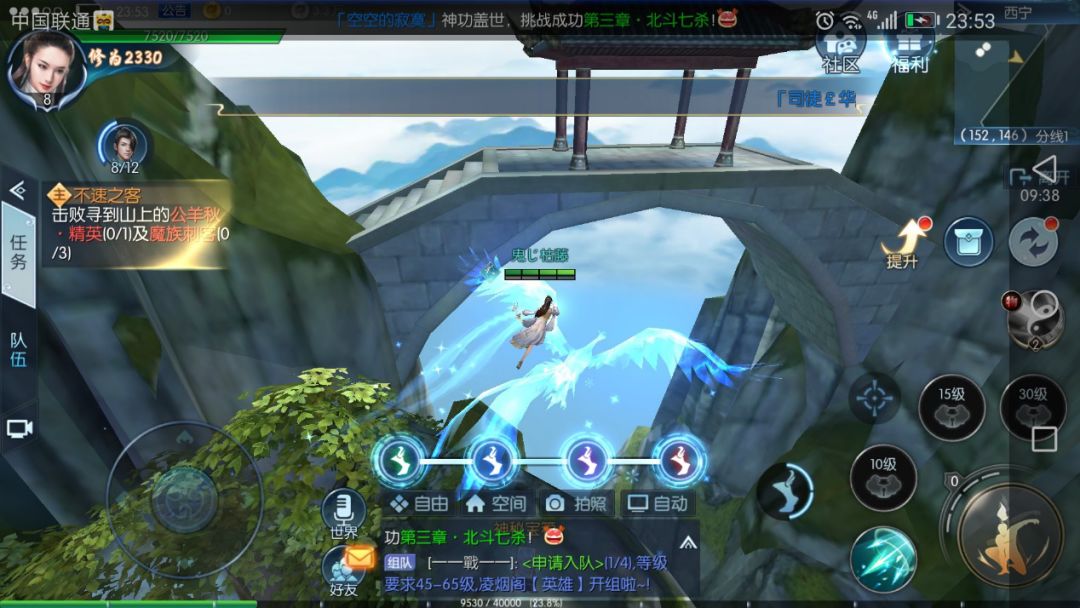 3. 极具特色的游戏玩法,带来全新的感知体验。《择天记》手游的一大特色就是“轻功”。通过轻功,玩家可以穿越地形、建筑、悬崖等地形进行操作,并且游戏中的轻功支持四段飞行,当玩家的内息足够时便能施展轻功,并且在过程中玩家还可以任意改变视角和方向。轻功过程持续时间适中,每个角色展示的特效也非常有创意。不过,轻功需熟练掌握才能更好的降落飞行。另外一个特色在于“结伴修行”。在游戏中原著角色悉数登场,玩家随着剧情的推进可以结识落落公主、唐十三六等NPC,与他们一起结伴修行。而且,游戏设置了组队系统,玩家可根据自己的需要进行匹配,也可以在公屏中喊话进行队友招募,邀请等,整体设计上非常出彩,满足了社交的需求。