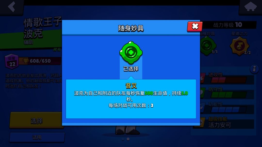 波克释放一圈治疗波,为自己和队友在5s内恢复每秒500点生命值,音叉十分强大,可以用于团战前的准备,也可用于双排时双人血量不健康时的快速回血,以及决战来临时的快速恢复能力。可以在输出时恢复可观的血量,十分值得花1000金币去买!