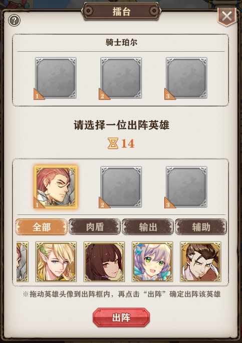 预备阶段结束后,进入英雄选择阶段,参加的双方交替每次选择一位英雄出战,每次选择时间为30秒;点击拖动英雄头像到出阵框亮起的头像框内,该英雄判定为预出阵状态,再点击“出阵”按钮,出阵该英雄。没有确定出阵时,仍可以替换预出阵的英雄。若倒计时结束仍未确定会自动出阵处于预出阵状态的英雄。