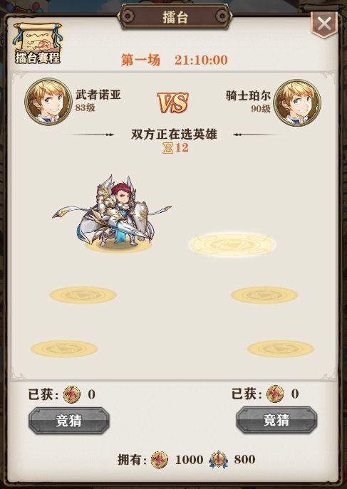 预备阶段双方参赛玩家可以滑动查看英雄,但无法选择出阵,所有英雄均为系统预设,等级、装备等保持一致水平