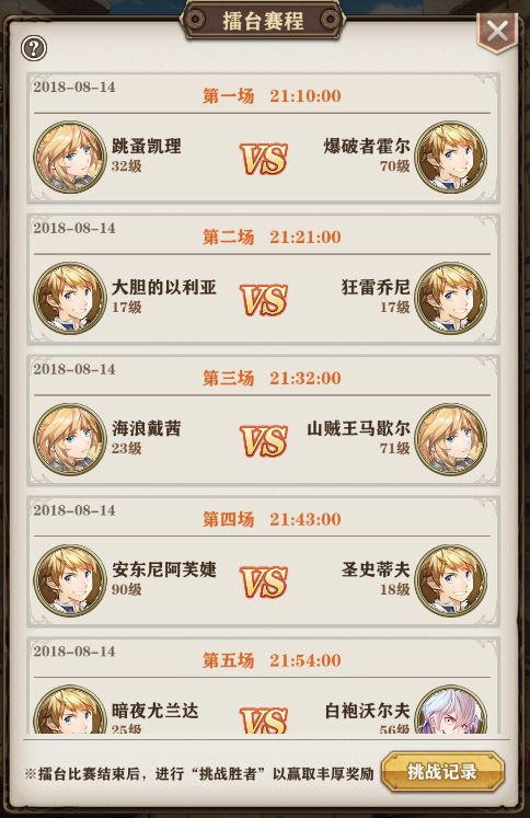 7.当天所有赛事结束后“擂台赛程”显示当天所有的比赛结果,并可以继续挑战胜者,直至第二天晚上20:00,第二天的擂台赛入围玩家对阵信息刷新后之后,变成第二天的赛程。