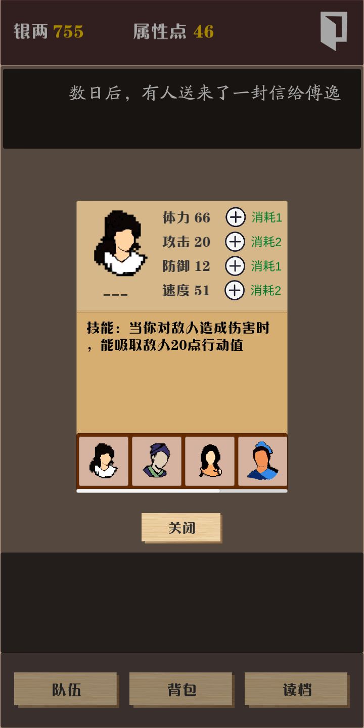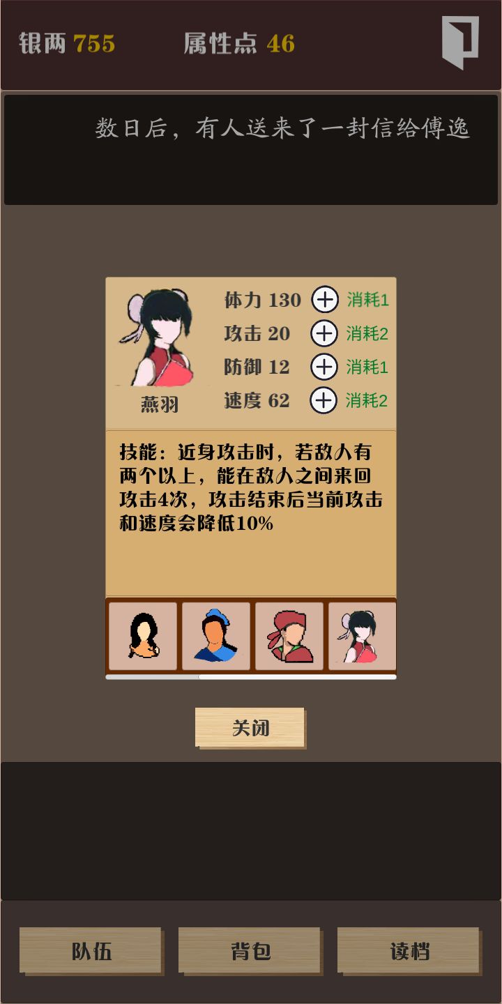 基本上的天赋点都给贾道扬加生命了,一路上快快乐乐,苟出一片天,队伍中有降对面行动值的主角和燕羽,如图
