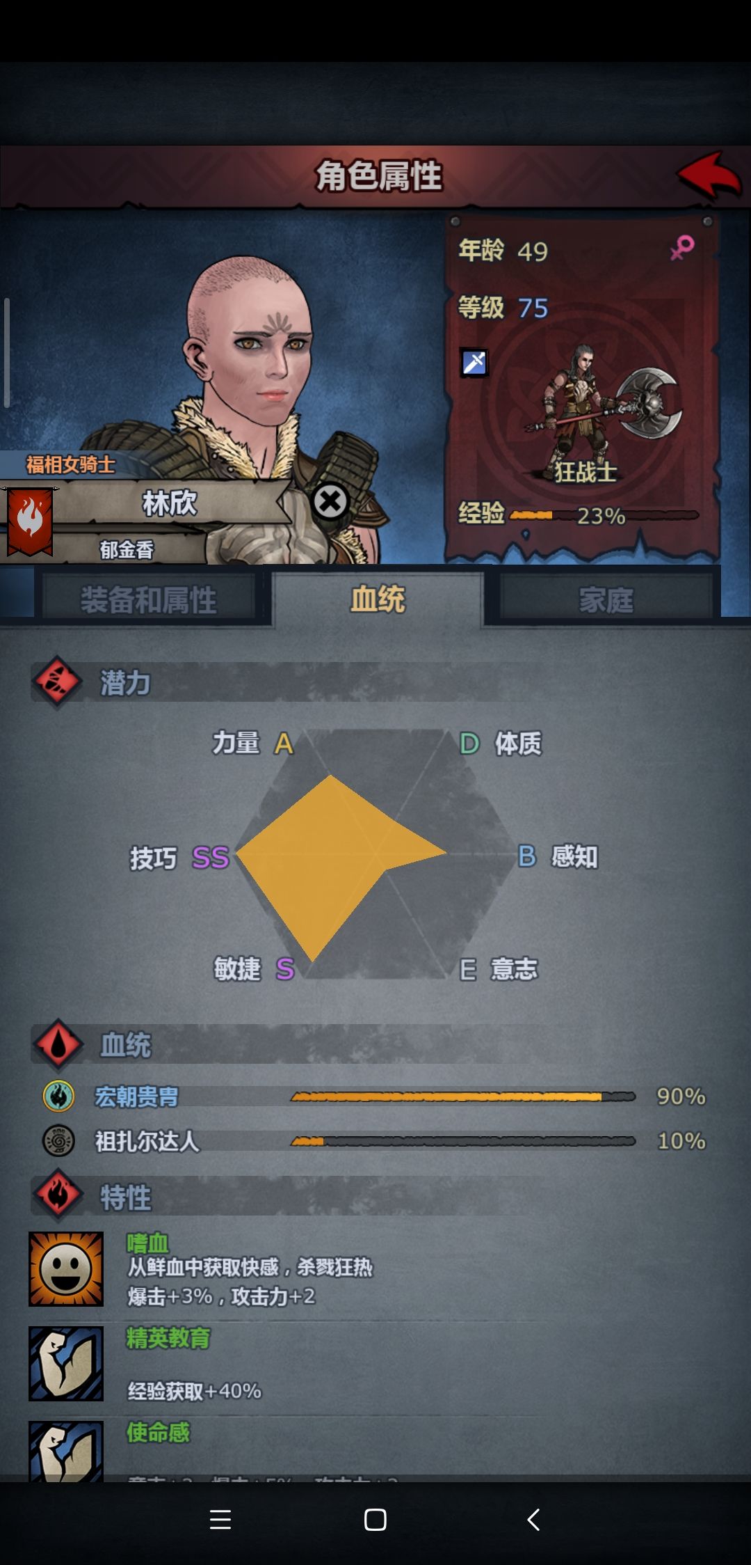 然后来说一下为什么选宏朝来做狂战,首先说一下宏朝的属性偏向,宏朝力量能达到a,技巧SS,敏捷SS,SS的敏捷,让狂战基本上在对上任何人都能先手反击,SS的技巧,基本上打人都不会偏斜。然后有人觉得宏朝力a伤害会不够,看一下狂战武器,不做传家宝面板就达到了74攻击力,并且狂战的职业成长,力量达到S