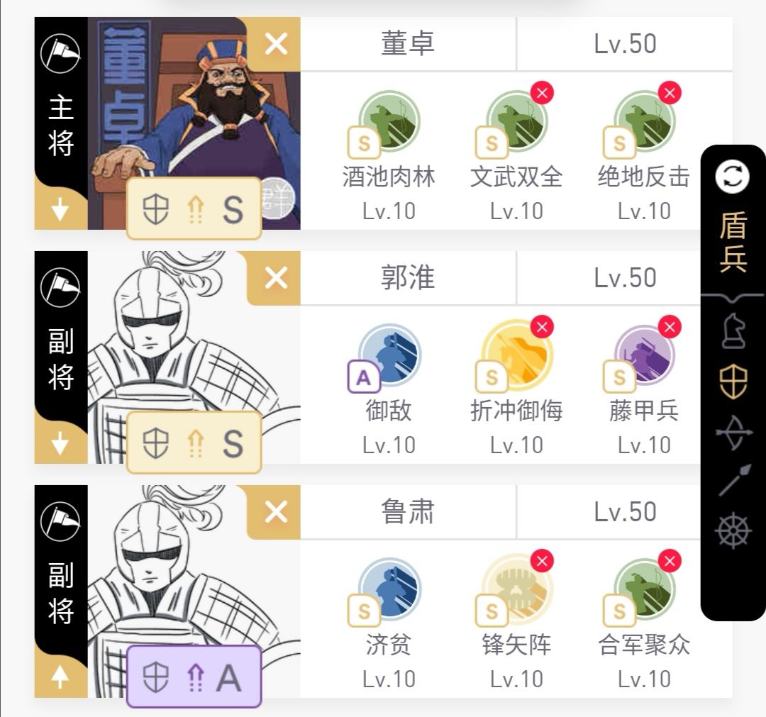 而且,带了鲁肃之后不怎么怕禁疗了。鲁肃的济贫好施自带刮骨援其必攻,满级能提供38%的减伤,前文提过鲁肃的血线能得到保证,如此就在三四五回合充分利用鲁肃的巨额奶,让董卓不依赖第五回合的吸血,只要撑过前三回合(鲁肃速度慢,第三回合的奶在最后生效)即可。这队,依然怕太平大火,依然怕都督,但是不怕单独的禁疗(从第三回合开始董卓每回合都有巨额奶/倒戈,就算没有奶也有减伤),不怕单独的虚弱(虚弱一回合还有三回合,董卓四个回合连续输出),依然怕藤甲法盾但大不了大家打平,友谊第一点到为止。至于当锋摧决,孙权太史慈的吴骑吴弓以兵刃为主,打不动藤甲,三势无当弓锦帆弓也是一样的问题,况且这三个人并不是弱智,董卓的血线有济贫好施酒池肉林双保险,根本不怕。最后说混乱,这东西全靠脸,但是这队队友兵刃减伤叠满,酒池肉林全体攻击,就算刚好第五回合混乱绝地打队友也不会造成太大影响,算是比司马盾好的一个点。