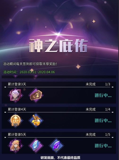 2.「神之庇佑」活动上线,每天登录即可获得宝石,英雄碎片,晶蓝符石等奖励。活动时间:3月31日11:00—4月6日23:59。