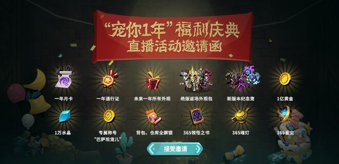 1亿黄金、1万水晶、一年月卡、一年通行证、未来一年所有外观以及周年庆绝版返场外观包、3只新版本纪念宠全送、专属称号“巴萨坦宠儿”、背包仓库全解锁、365领悟之书、365魂灯、365星尘....怕是直到2020年的两周年庆前,在贪2你都能衣食无忧~