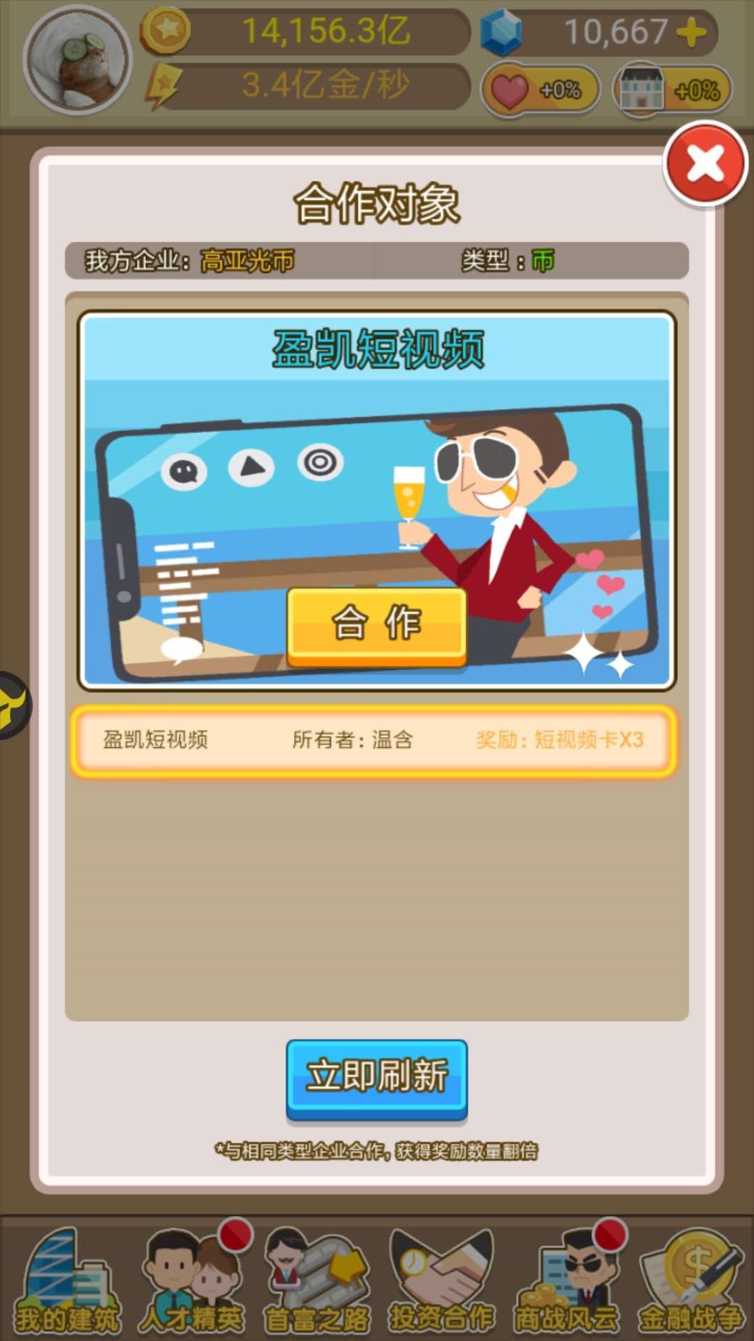 企业合作的话,可以选择自己发起合作或者是与对方公司合作,合作成功能够获得升级企业的卡片,与相同类型的企业合作,更能获得翻倍奖励!