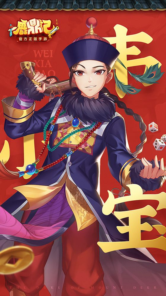 最后曝光的是韦小宝的正面大图,左手骰子,右手火枪,表情似是戏谑,神态倍儿神气!难怪可以征服七美。