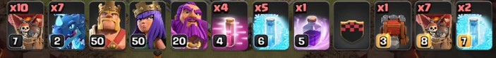 配兵方面,电龙带了7只,这是标配。气球带了17个,为什么带17个气球呢,这里要注意的是,气球的作用有2个,一是为电龙抵挡黑炸弹,一个是战车冲中圈的时候,气球吃到狂暴法术会直接选择攻击附近的防御建筑。那么这样就减少电龙的压力了!毕竟攻速在那里了。法术方面是7个冰冻,4个加速,1个狂暴,后两个法术就不多介绍了。这里主要说下冰冻,有的人也许会问有必要带7个吗?其实个人是想带十个的,但是怕电龙飞得太慢耽误时机,所以这里只带7个。同时,地图上的地狱塔都是单头的,电龙虽然血量高,但也禁不住防空火箭的攻击,所以带7个冰冻法术并不多。狂暴法术带1个也不会少,因为狂暴这个法术主要是炸中圈这里的,因为对面的女王也在那里,如果不处理掉,会给我们的空军带来非常多的不确定性。